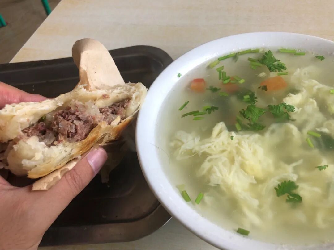 我没想到,任丘的驴火很不错。虽然是保定的圆火烧,但是像河间的方火烧一样很酥脆。有没有发现,我很爱喝鸡蛋汤。