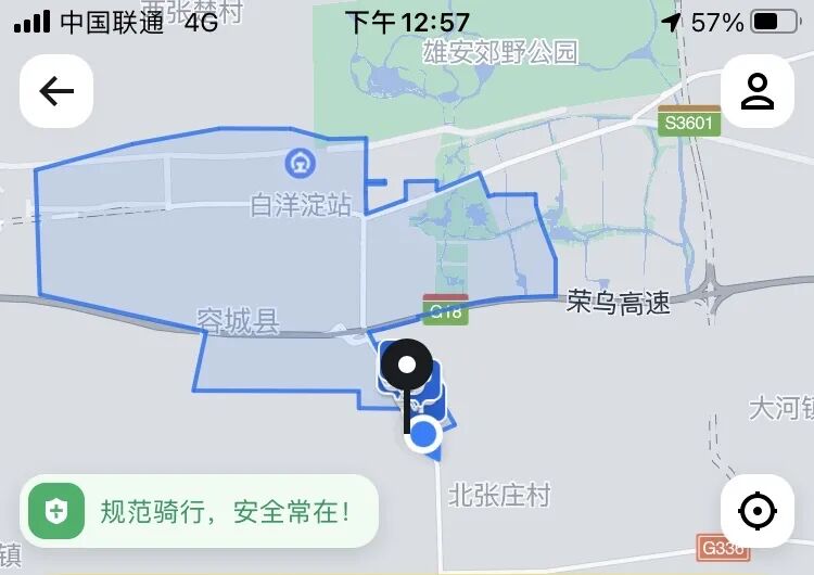 从容城到白洋淀,其实距离并不远,而且是直线距离,但却没有公共交通。我本想直接骑小电动过去,但小电动有区域限制,出了区域会断电。打车吧,我先骑小电动到了区域的最边缘,然后在平台上打车。