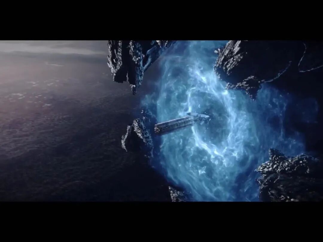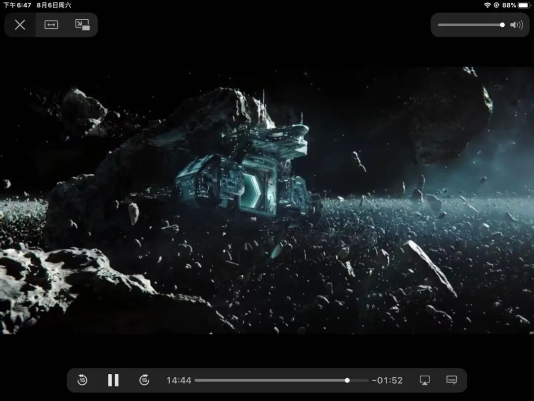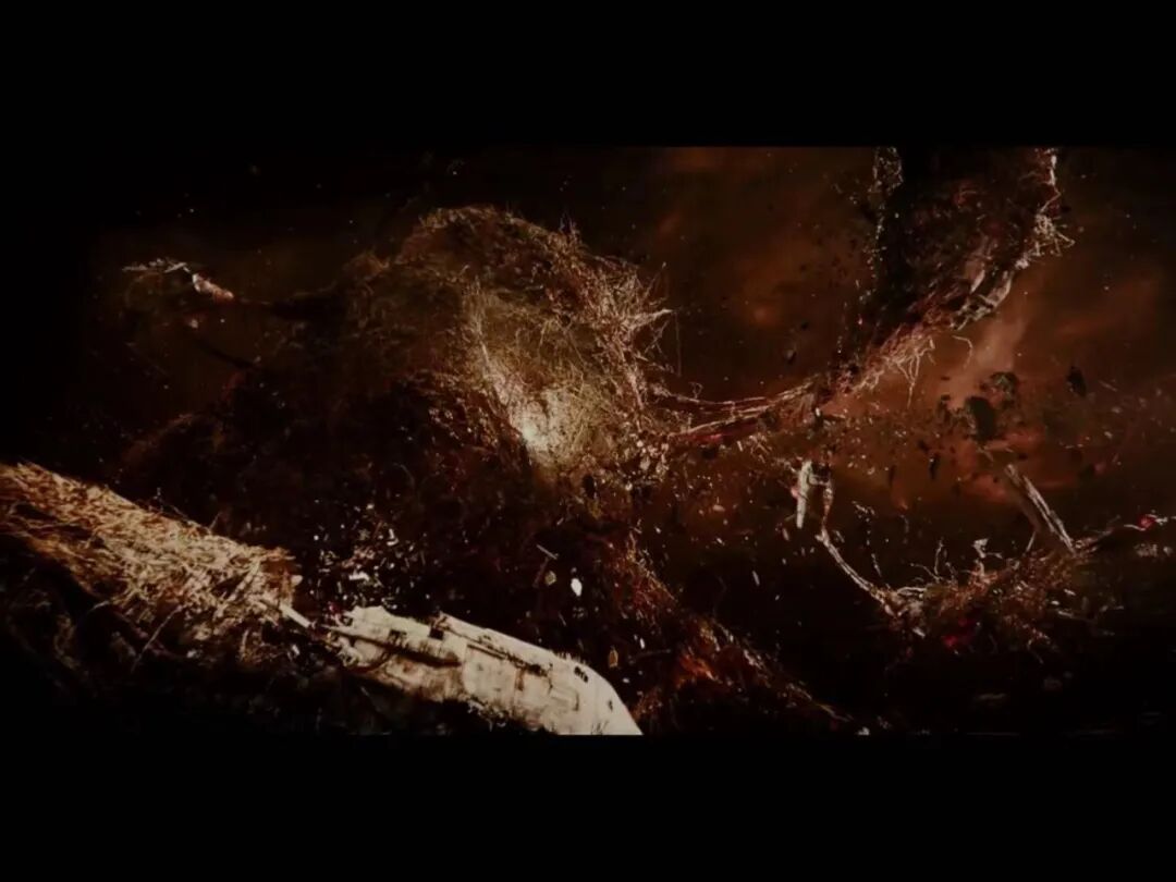 飞船外是美丽的小行星带。画面变频闪过,现实中是毁灭的一切……
