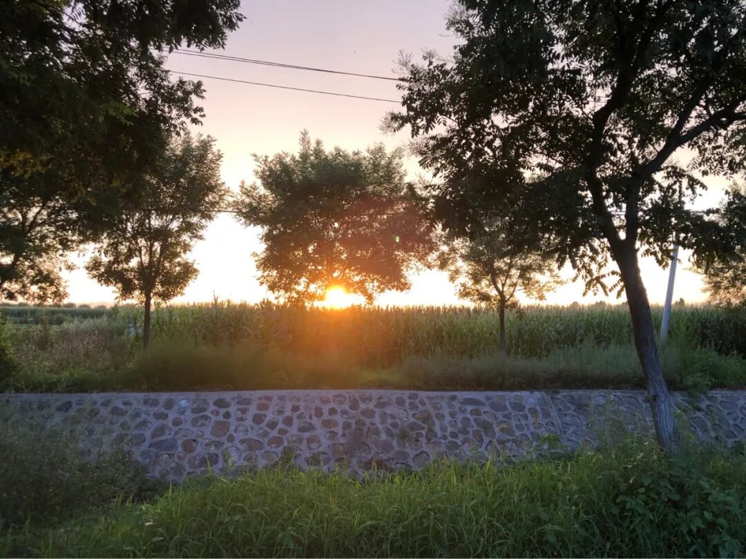 路边一片片的玉米地,茁壮的、翠绿的生长着。晚霞映着红云,美极了。