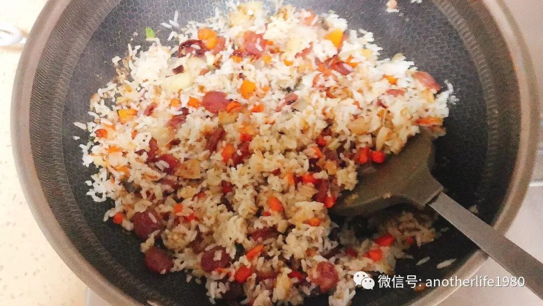 然后依次加入葱、腊肠和洋葱,米饭下锅一起炒。