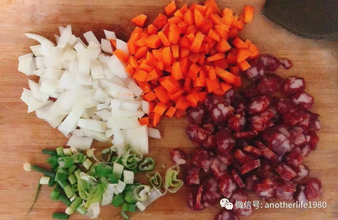本来想做蛋炒饭,但家里一个鸡蛋也没有了,把冰箱里有的翻出来。