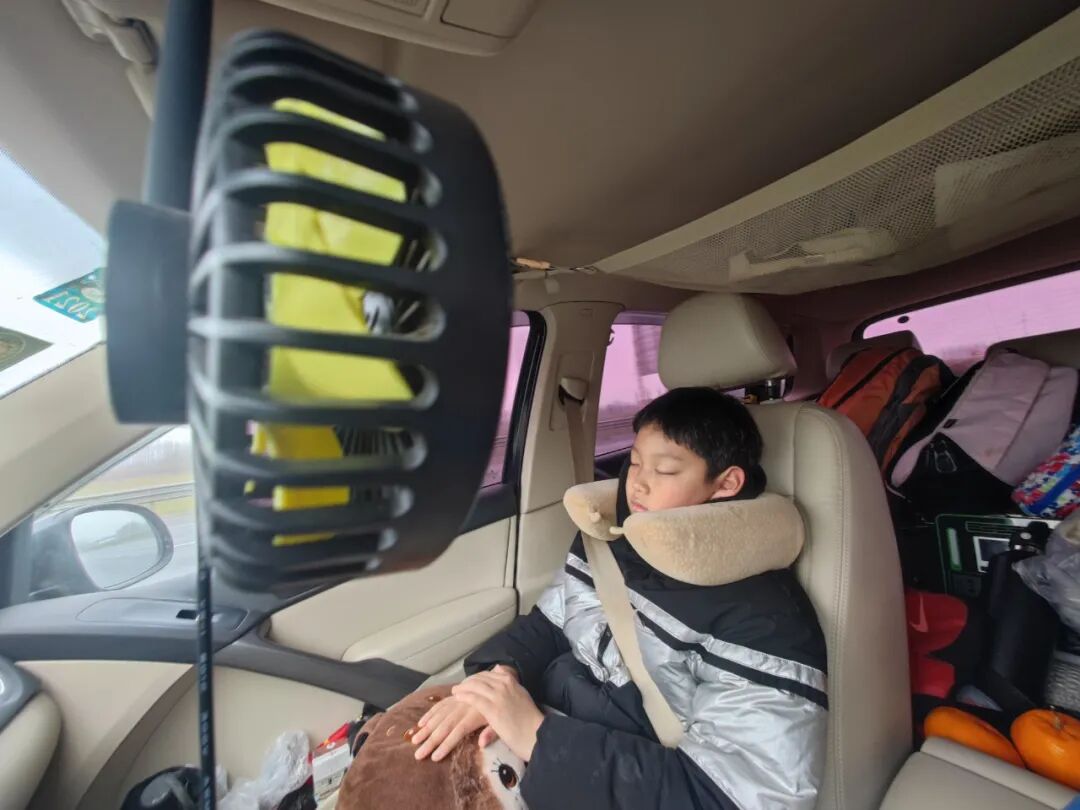 他几乎是睡了一路。上车前,我从车里找出了U型枕和靠垫给他,我车里拉的东西是很多,但几乎需要什么我都能翻出来。哪怕就是在穷乡僻壤找不到住宿的地方,我都能带着儿子在车里铺上被褥睡觉。