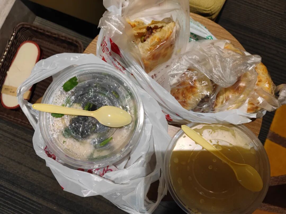 打包了6个火烧,分别夹红烧肉、夹牛肉、夹豆皮海带等,一碗紫菜蛋花汤和一碗小米粥。