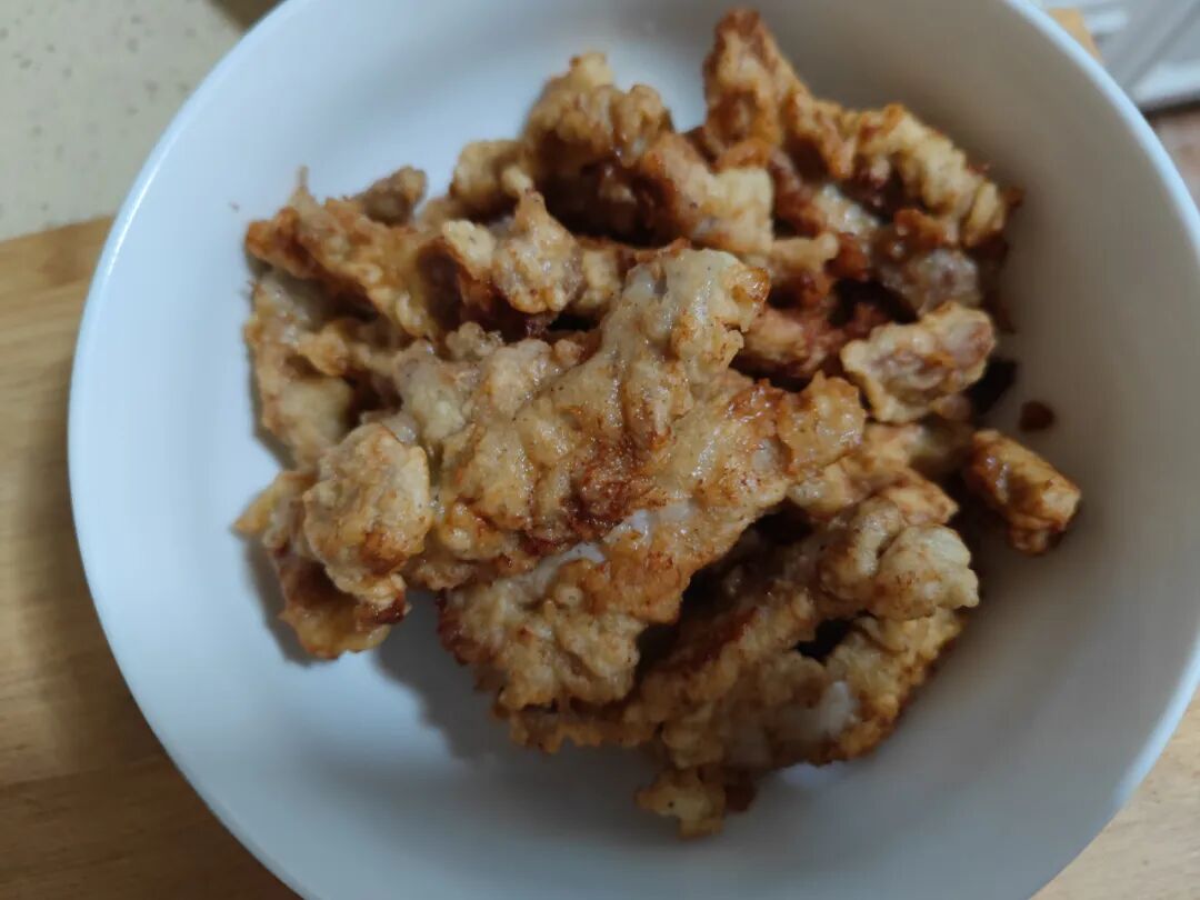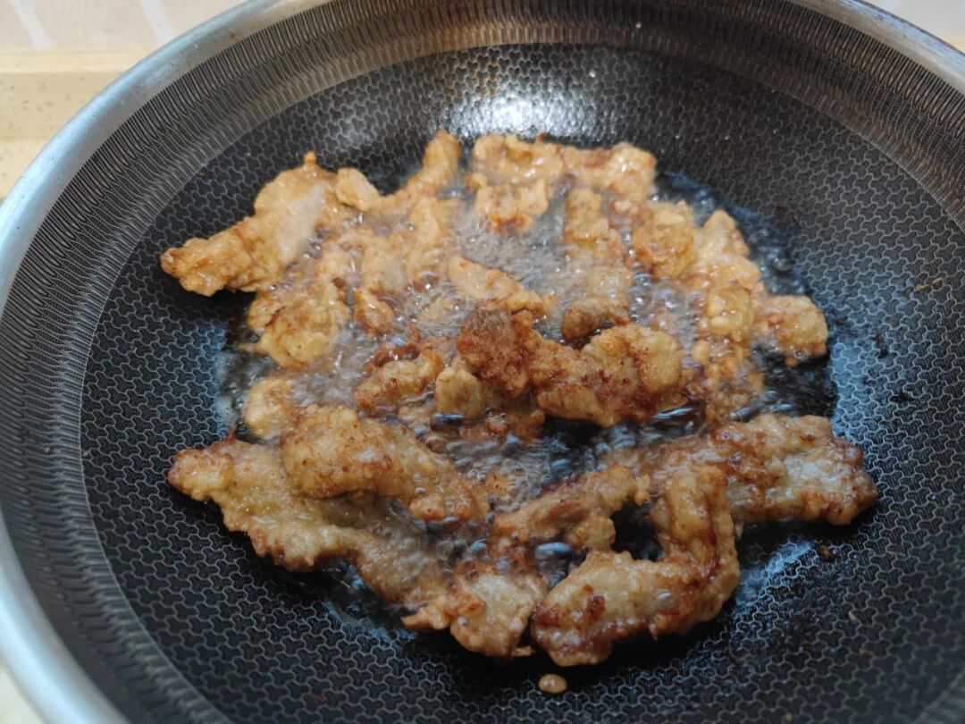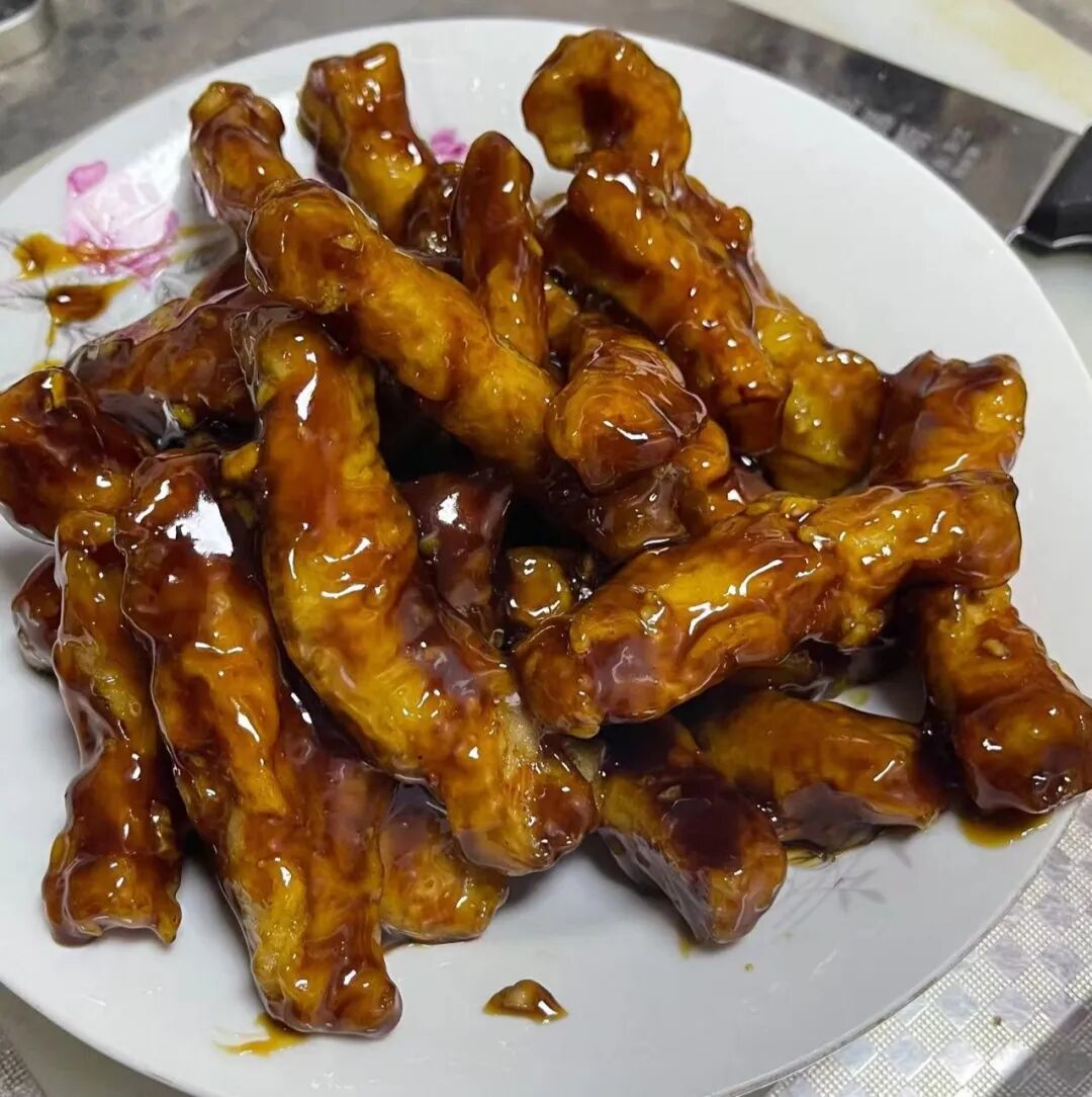 1、炸肉:将腌制好的肉倒入面糊,搅拌均匀,确保每根肉条都挂上浆;起锅烧油,油温5成热(筷子扎油里冒泡)一根一根的下入里脊,少放避免粘连,下锅后不急翻动炸30秒定型,然后把每根分开,大概炸到金黄色即可捞出炸下一锅,都炸好以后,油温提高到7成热把所有里脊倒入炸30秒左右捞出。
