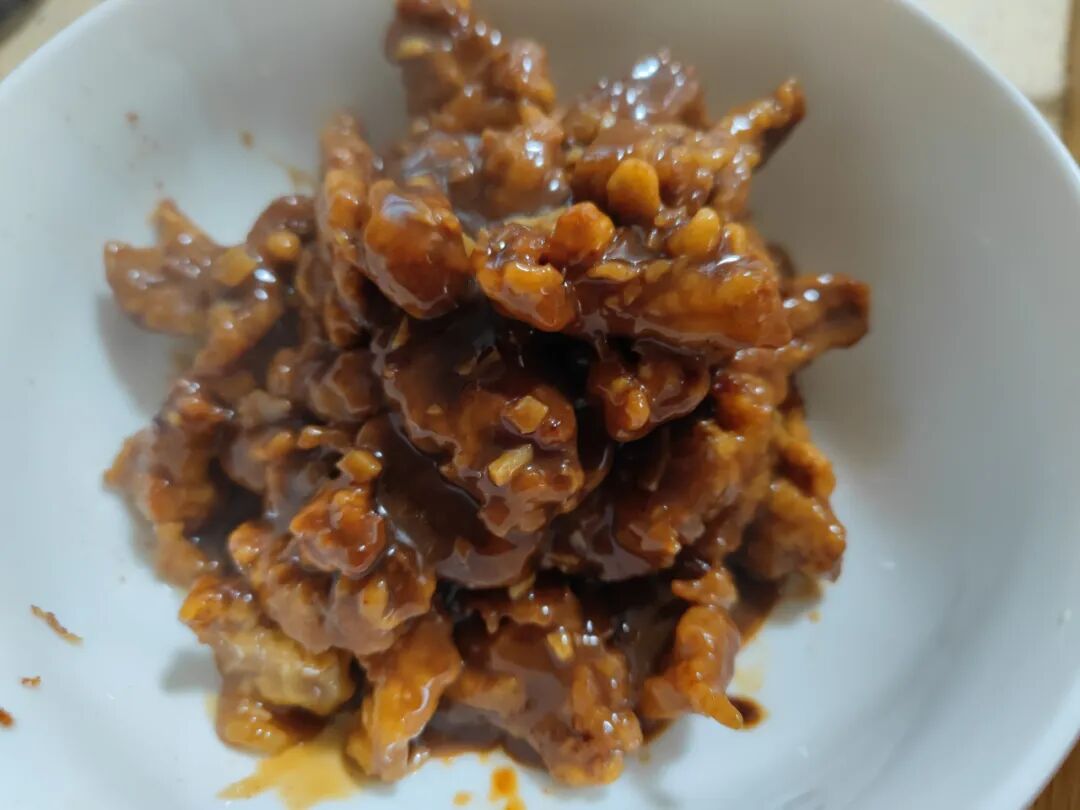2、制作:小火,锅中一点点底油即可,油3成热倒入蒜末,炒出蒜香后倒入糖醋汁,搅拌一下然后转中大火,一边搅拌一边倒入芡汁,需要掌握勾芡后糖醋汁的状态,差不多粘稠了就倒入里脊,翻炒均匀,出锅。