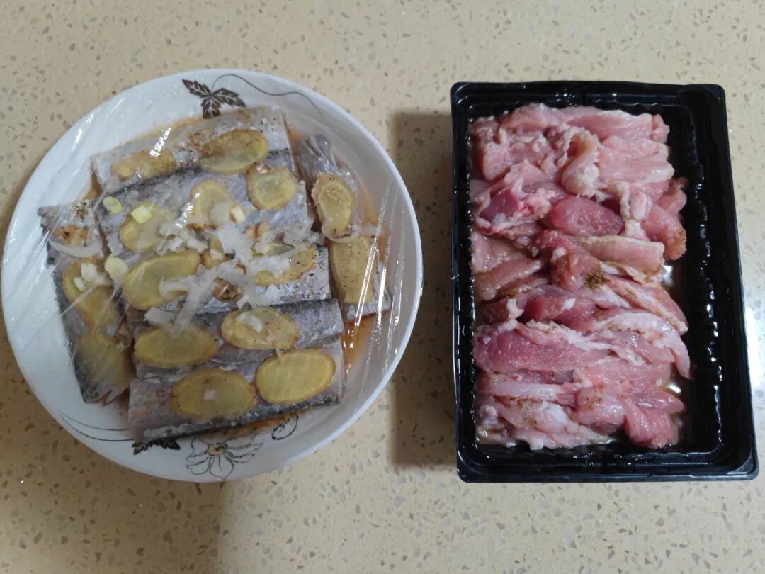 回到家,从冰箱里拿出我昨晚切好、腌制的带鱼和猪前腿肉,就是我前天文章里贴出的40多元购物清单里的两样儿。