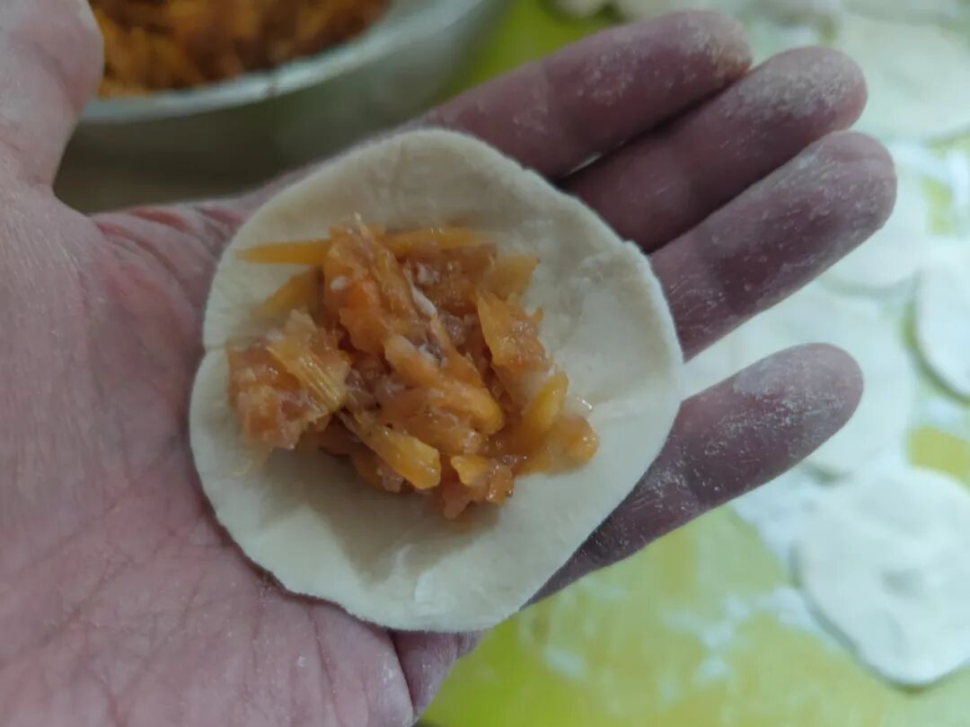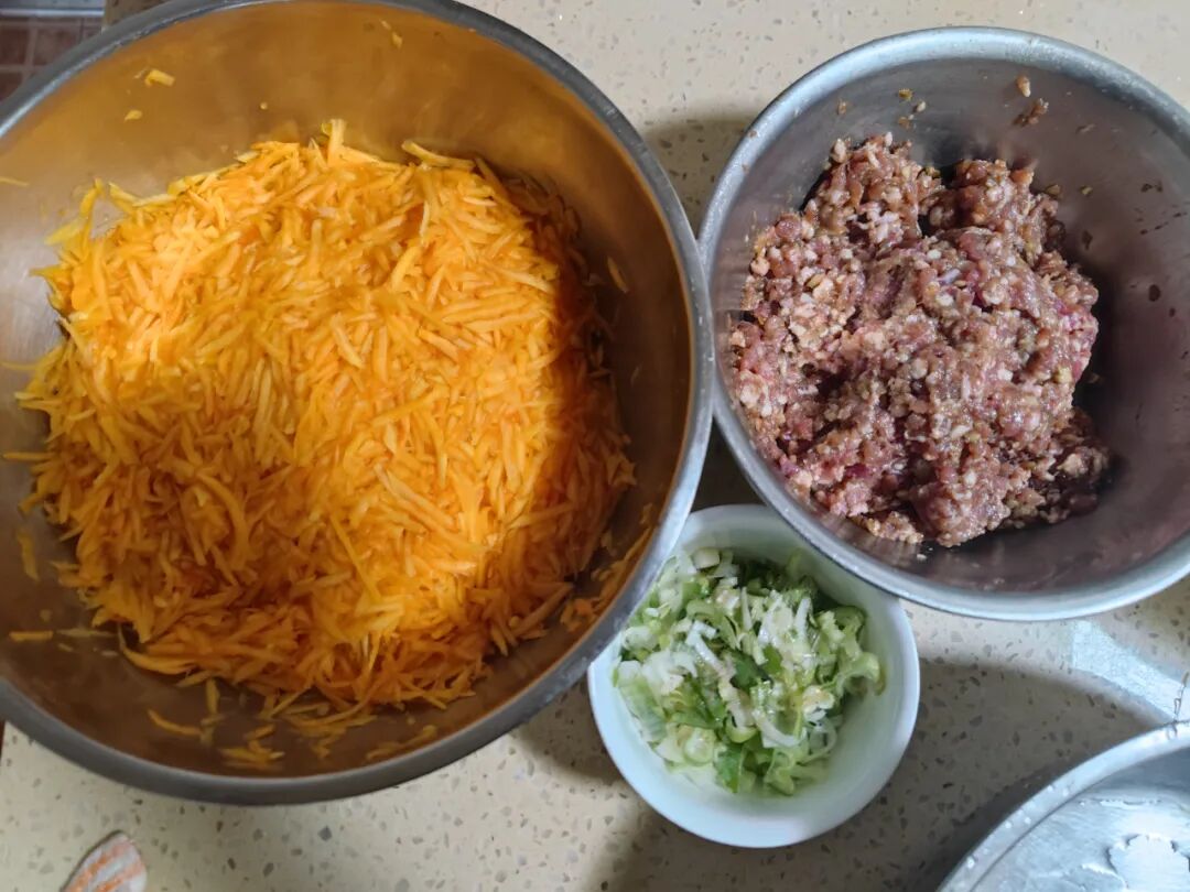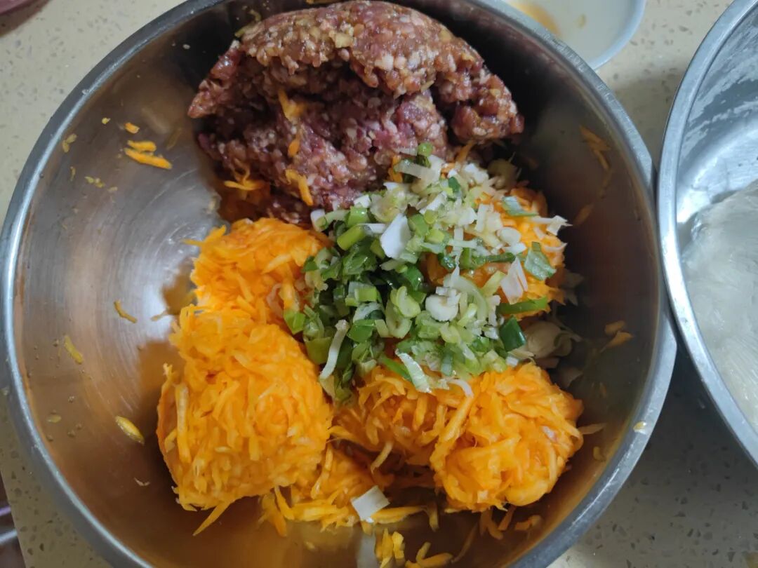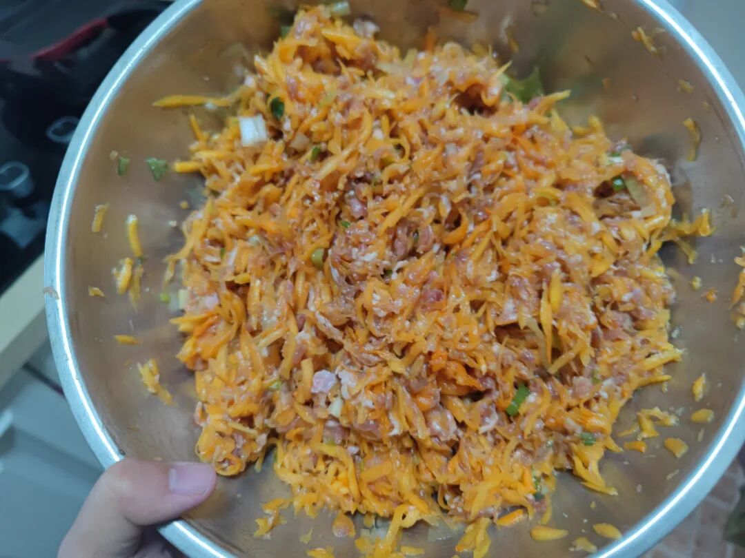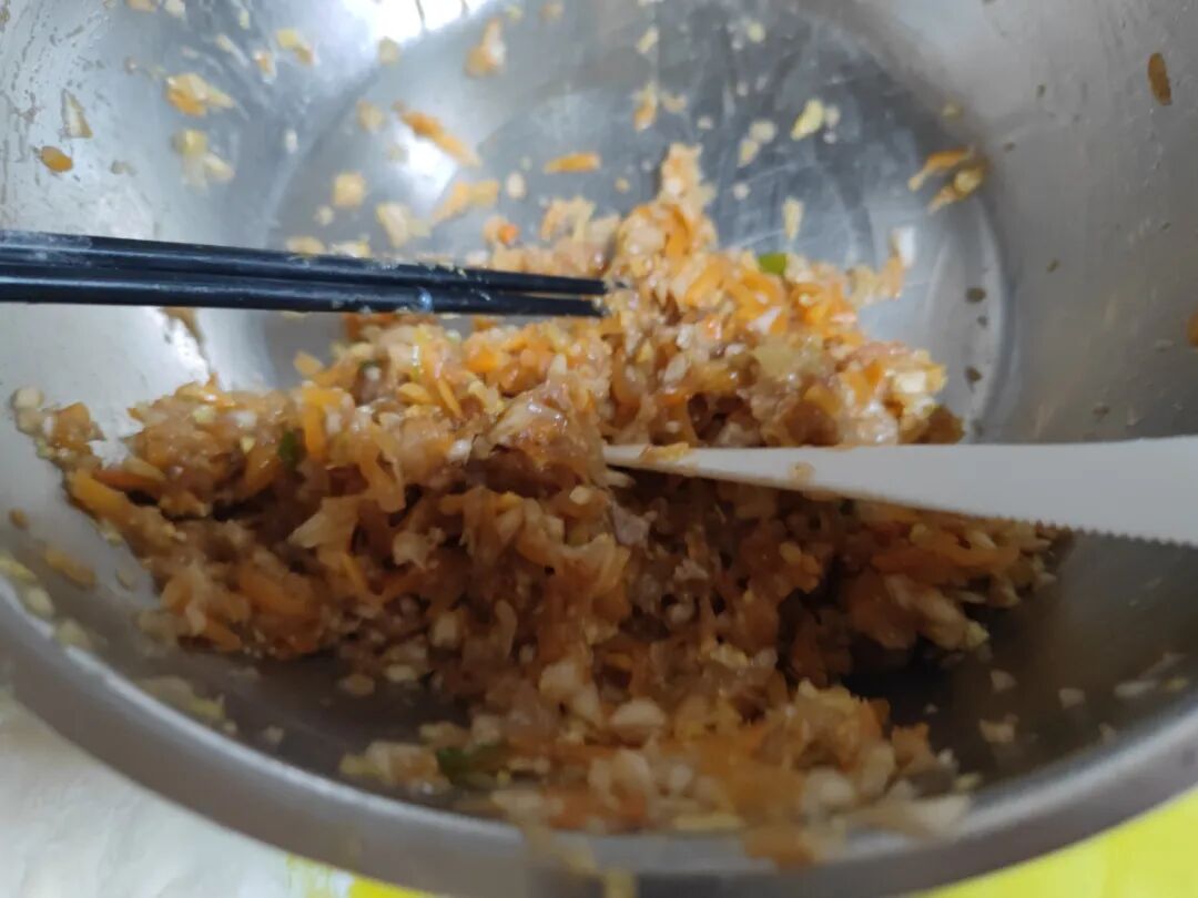 反复搅拌调好馅儿,倭瓜特有的清甜、调好味儿肉馅儿的咸鲜、饱浸香油的葱花香,哎呀妈,小时候的味儿出来了,直咽口水。