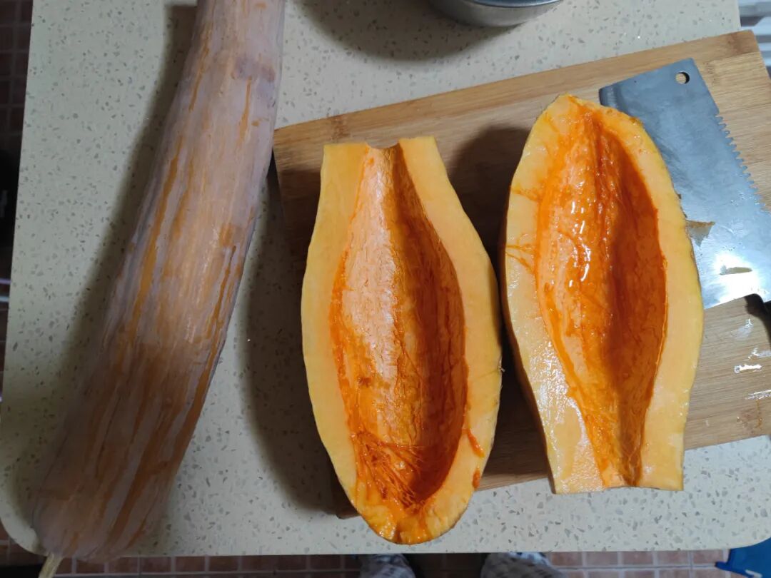 它在家里放了得有2-3个礼拜了,我一直也没拿它做菜。因为我平时自己炒菜都比较简单,而倭瓜我最想吃的是做馅儿,可做馅儿太复杂了。