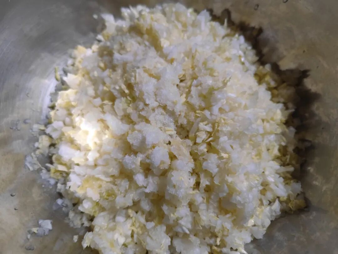 倭瓜丝儿撒盐、挤干水,和撒了调料的肉馅儿、加了香油的葱花儿倒在一起。
