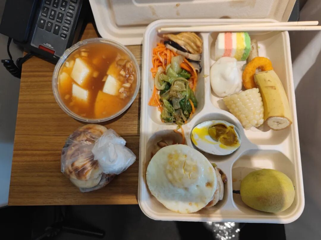 眼看快闭餐了,我问服务员拿了个饭盒,给他打包一些带回来。