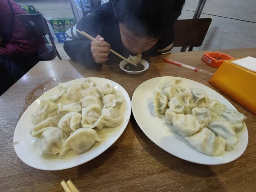 旁边有家水饺里面人不少,玻璃上全是水蒸汽,于是我们爷俩走进了这一家。