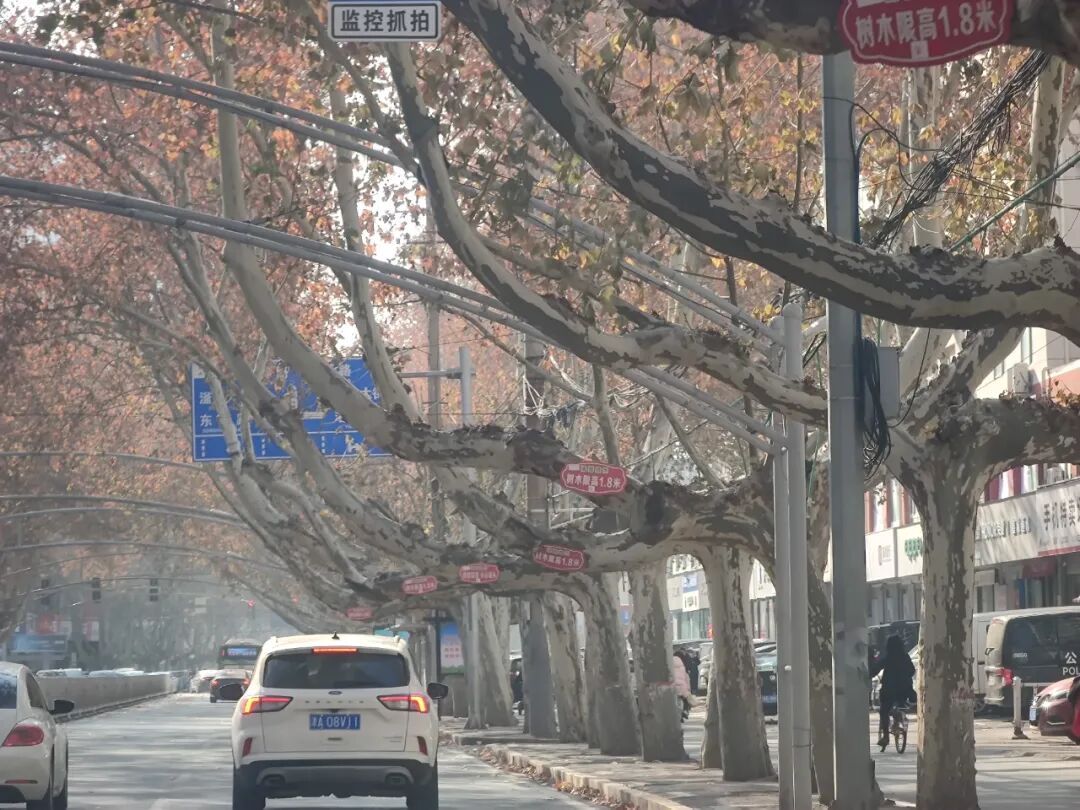 看完展览,我去买耳塞,邯郸路两侧的树很有意思,伸到路中间,每棵横长的树干上,标着限高1.8米。