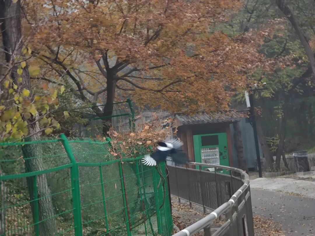我们一开始没想进景区,想绕着山走走看看红叶就好,路遇一只喜鹊。