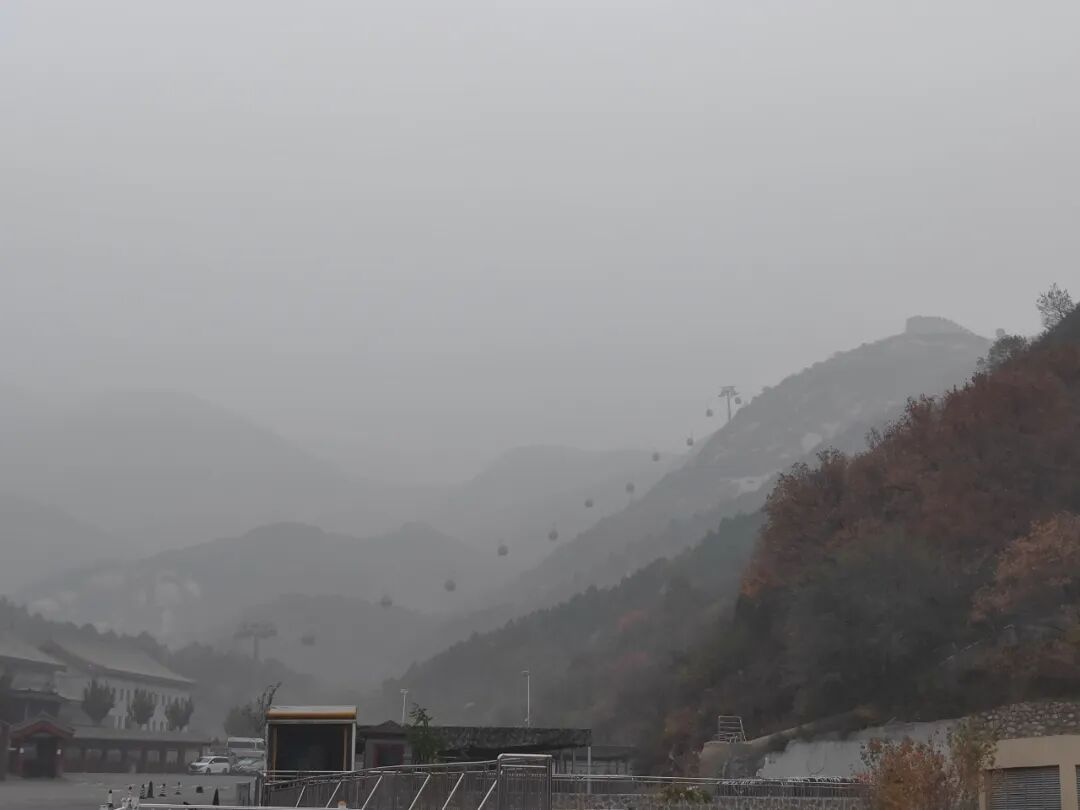 这个时候7点钟,八达岭正笼罩在雾中,缆车已经开动,缓缓往返山顶和山脚。