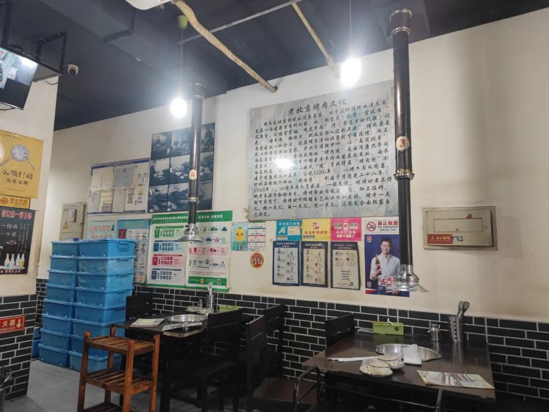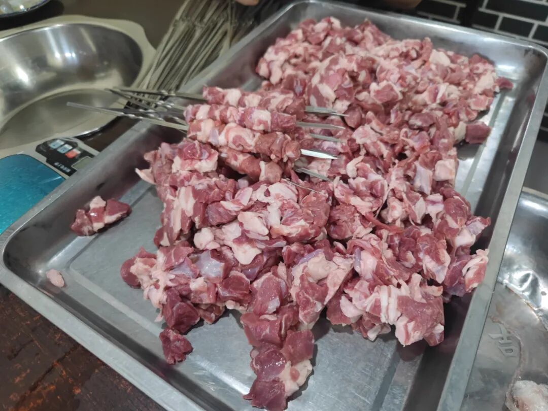 进门儿店里的人正在串肉串儿。