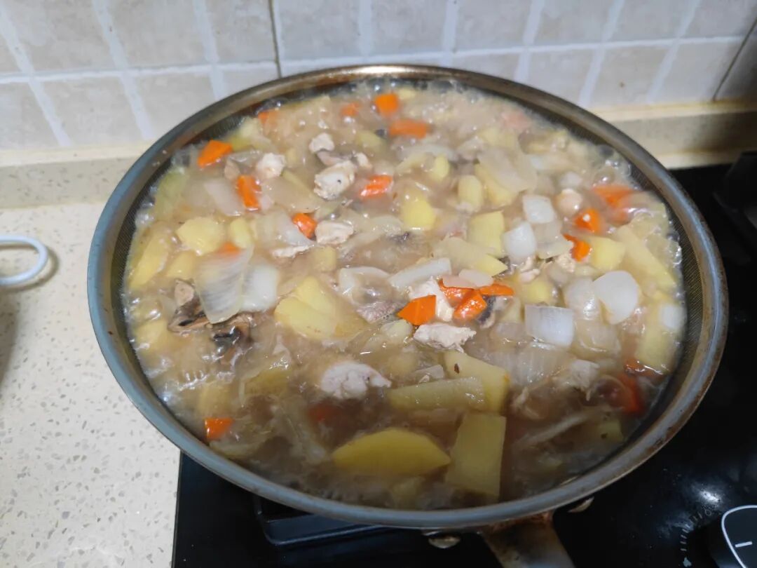 明明每一种菜都不多,一根胡萝卜、一个洋葱、两个土豆、两块鸡胸肉、六七个口蘑,怎么切出来放到锅里这么多……