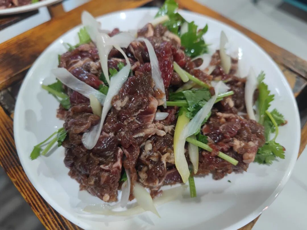 我俩撮了两盘牛肉一盘鸡腿肉,6个羊肉串1个大腰子,一盘金针菇一盘酸菜,一盘炸灌肠,外加两瓶大窑。