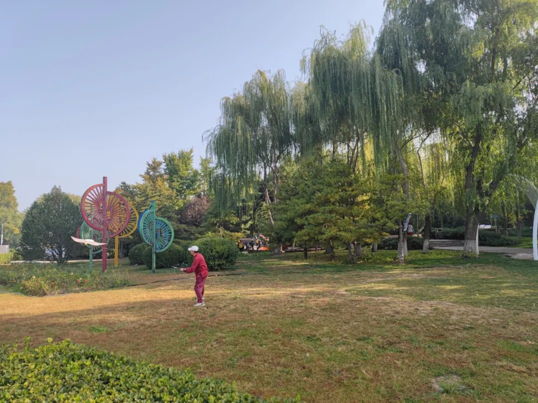 街边公园有人在玩风筝。