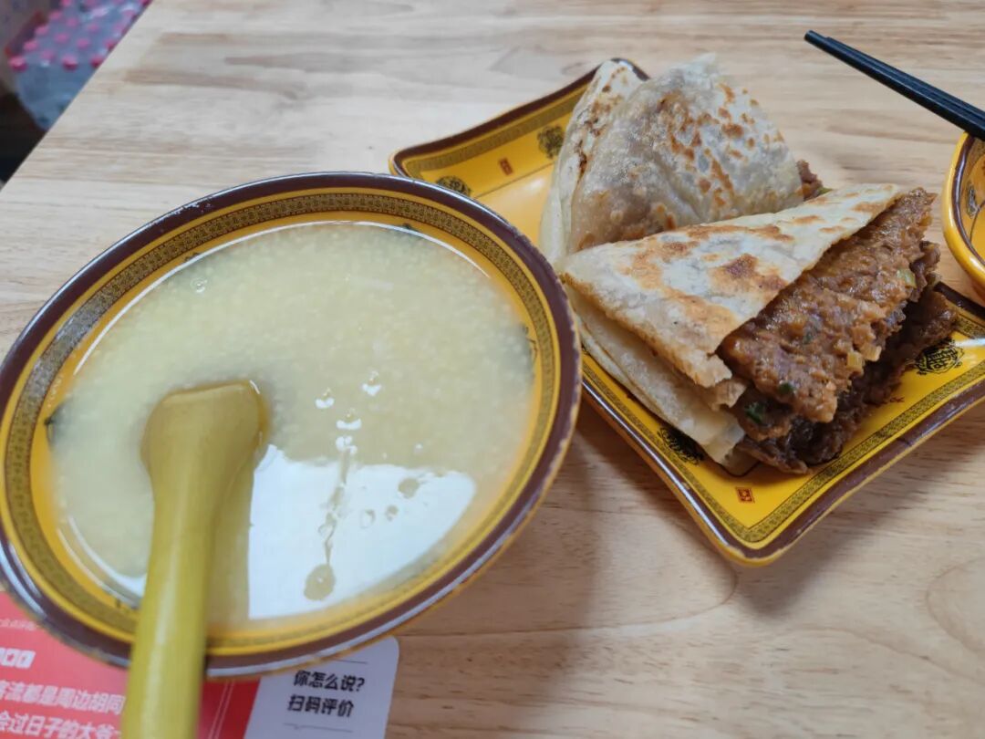 一张牛肉大葱,一碗小米粥,21元,够吃了。