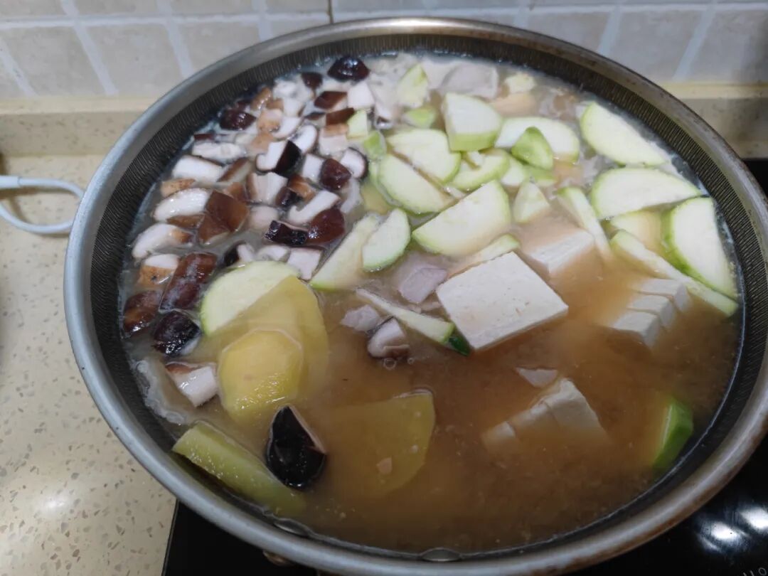 清水烧开,舀两勺大酱化开,倒入五花肉片,煮开后撇去沫子,然后下入土豆、香菇、西葫芦、豆腐。