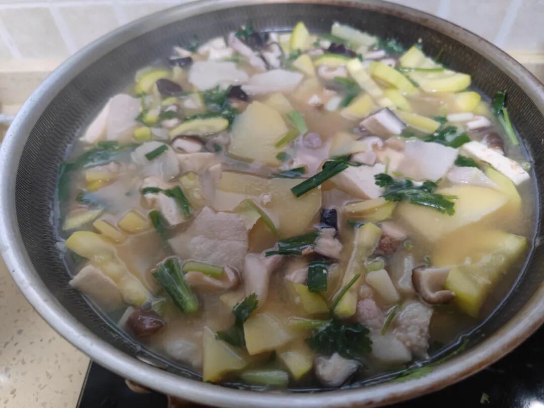 我做的虽然比不上人家,但也很好吃啊。自己做的饭,自己喜欢吃,干净卫生、吃着舒服,还便宜啊,我这一大锅撑死了也就15块钱的成本,一顿都吃不完,连菜带汤,就着米饭,生活简单美好。