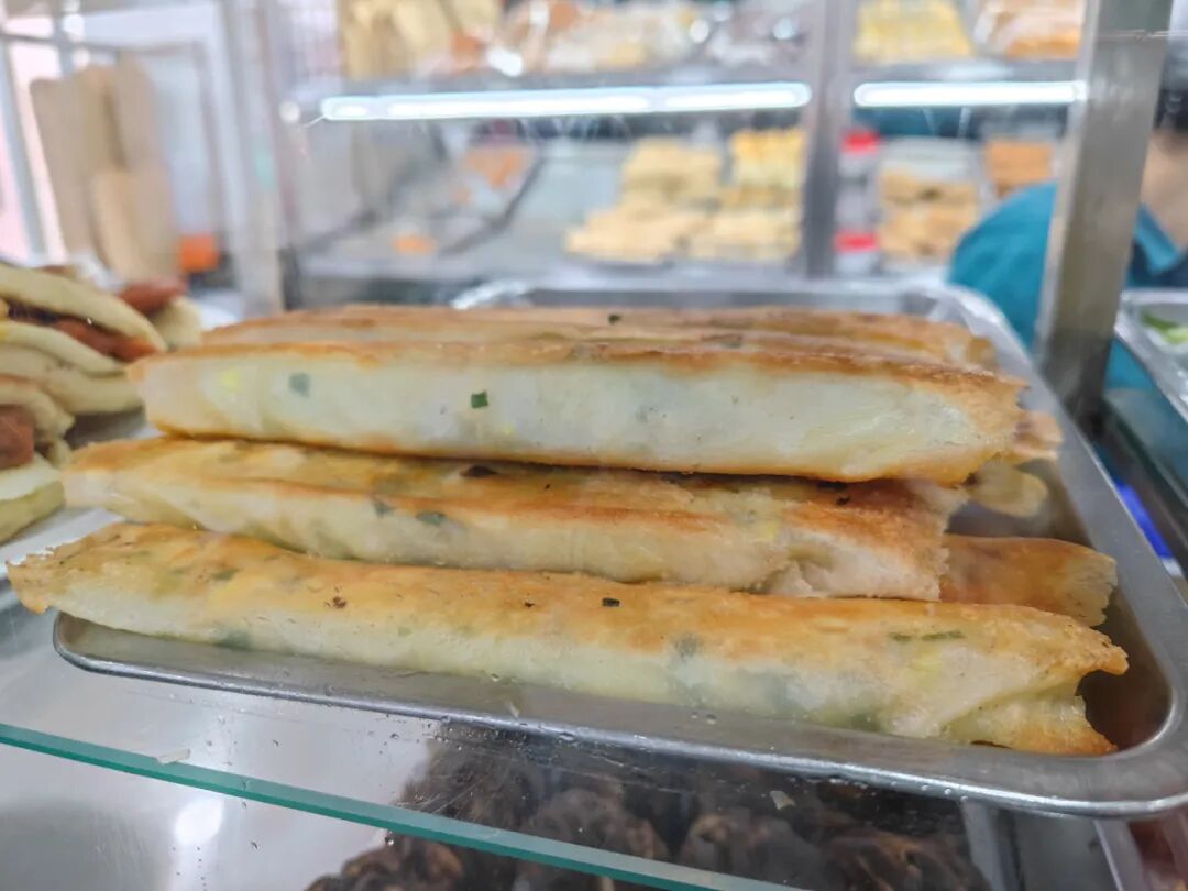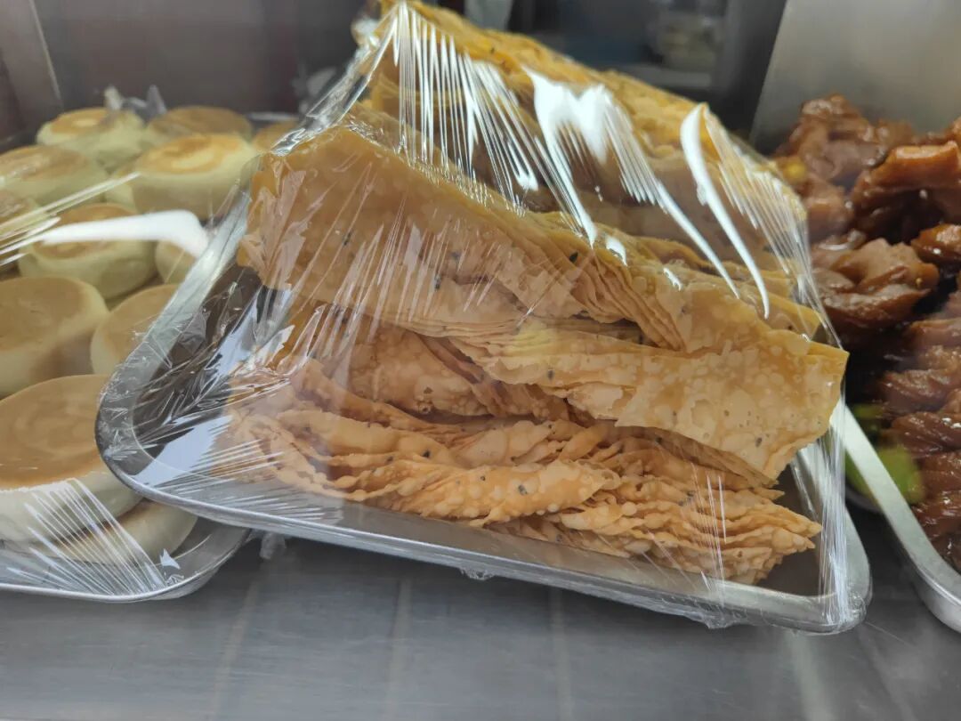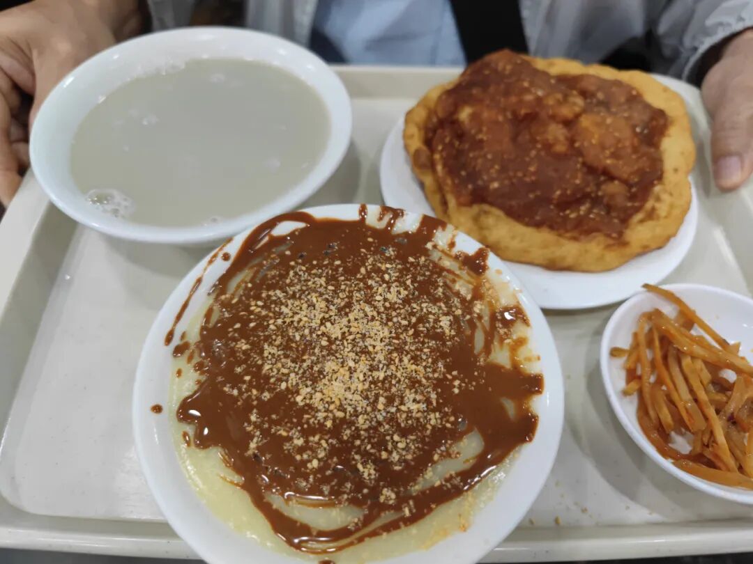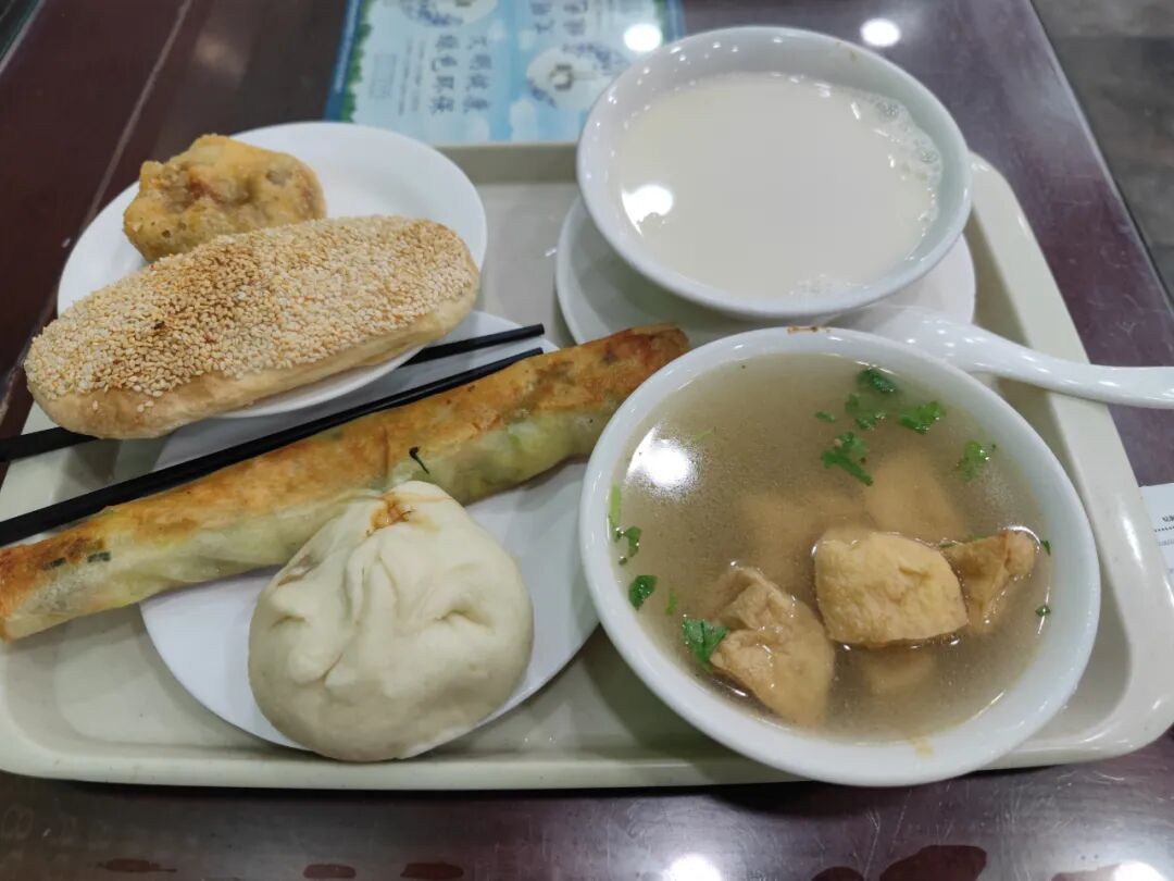 这是我点的,也是我常吃的,牛肉包子、烙春卷、炸糕、黄桥烧饼,一碗炸豆腐汤,一碗豆浆。