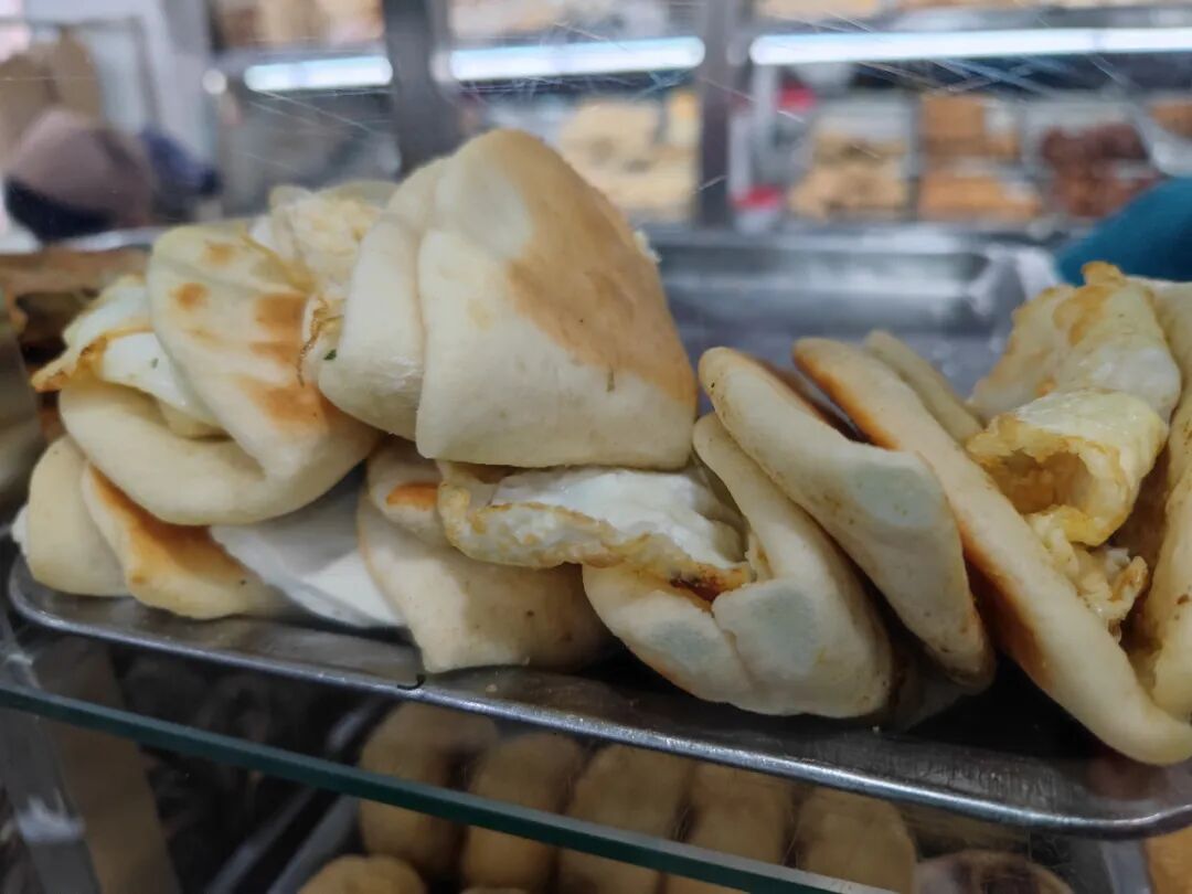 三角烧饼夹鸡蛋,里面撒着椒盐,味道不错。