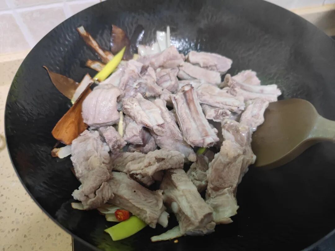 排骨煮去血沫后,和香料、黄豆酱炒香。