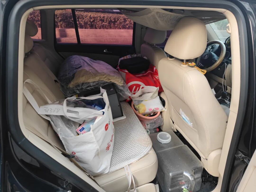 后备箱还是我睡在车里时铺的气垫和被褥,我后来都懒得再收拾,直接往后一卷,把车座抬起就可以坐人;等我想睡了,把后座放倒,一铺就可以上车去睡。现在后座放满了东西,后备箱再塞塞,就这样吧。