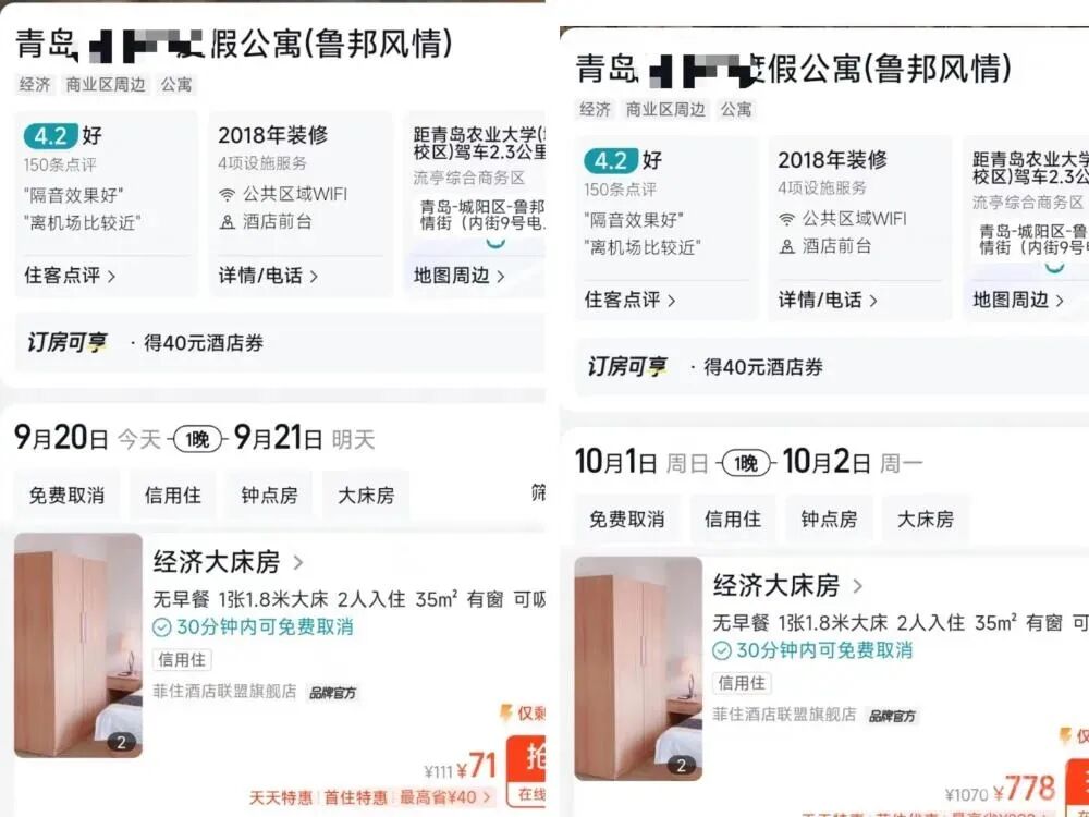 再看今天看到的这个,酒店民宿暴涨,涨个四五倍是正常的,这家极端的涨了11倍。