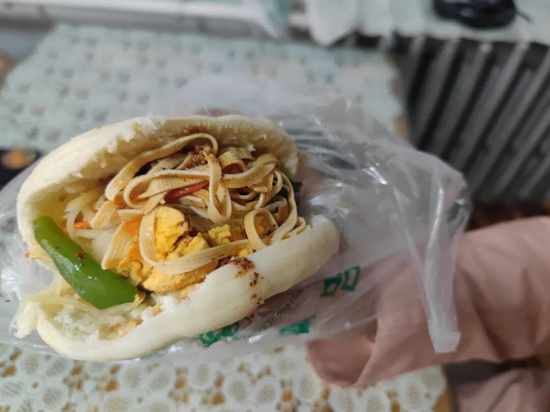 还夹了鸡蛋,浇上自制的酱汁,很好吃。