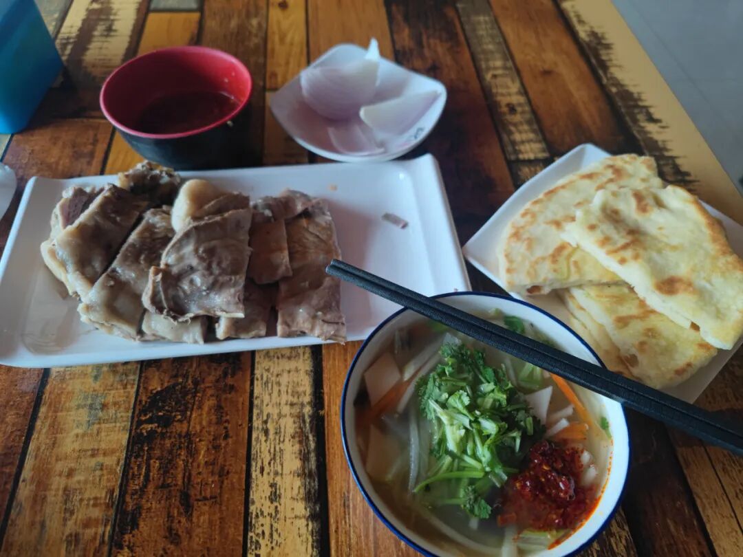 当然是吃不了了,我要半斤肉就足够了,饼很好吃吃了一半,烩菜吃完了,剩下的羊肉和饼打包,明天煮泡面吃。