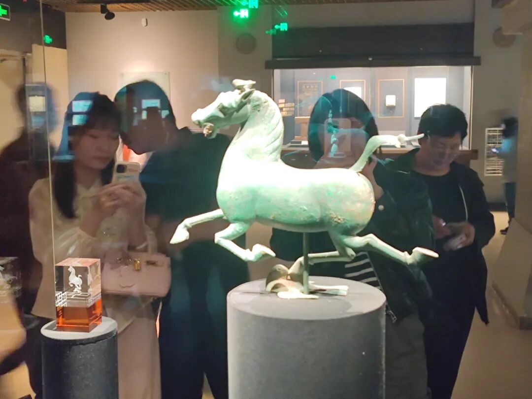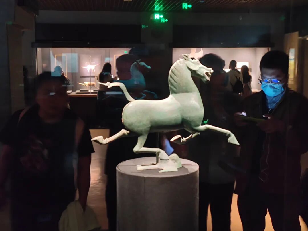 铜奔马,即著名的马踏飞燕。据说出土时,马脸上还有粉、红、绿等颜色的彩绘,但没有保留下来,也没有留下详细记录。