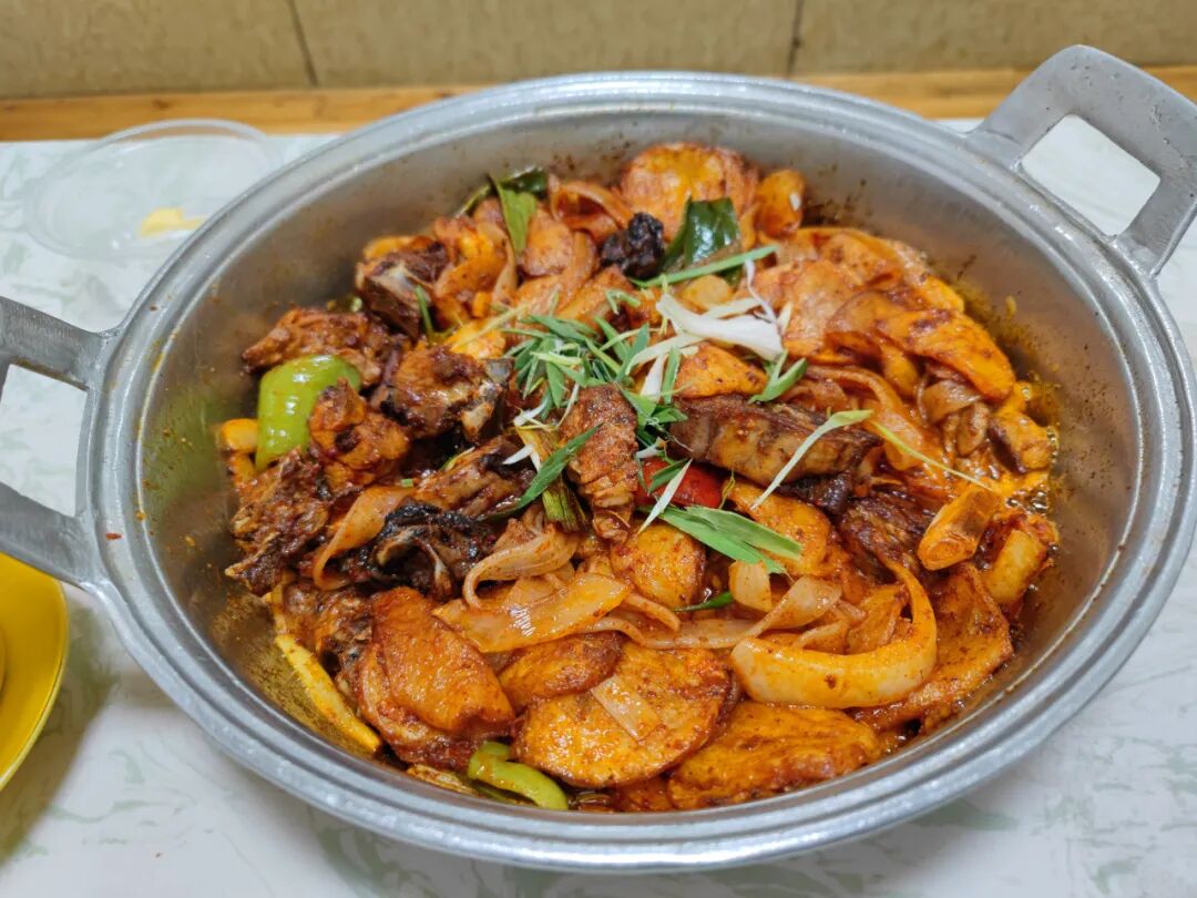 没想到上来是这样做的,里面有土豆片和粉条,洒满了辣椒面,做法很独特,绝对当地特色。
