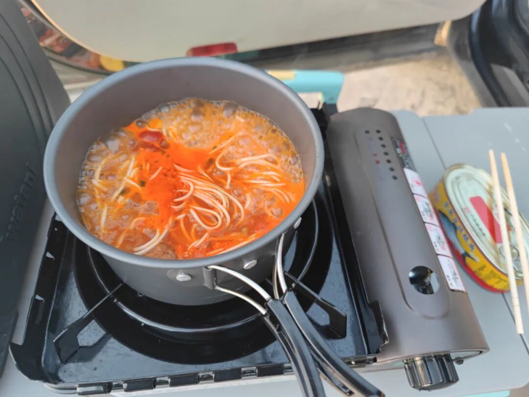 昨晚在水上雅丹停车场驻车,好多房车和露营的,我后面是6、7辆贵州来的车,应该是组团旅行,他们一起开火,支帐篷。而我一个人在他们前面,煮面,闷头吃,睡觉。