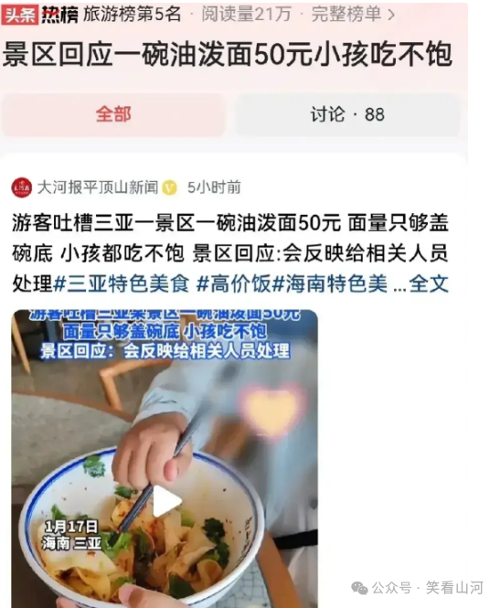 随后,焦点又转移到了三亚,这个阳光海滩胜地,这次并非是因为景区的美丽,而是一碗油泼面引发的轩然大波。