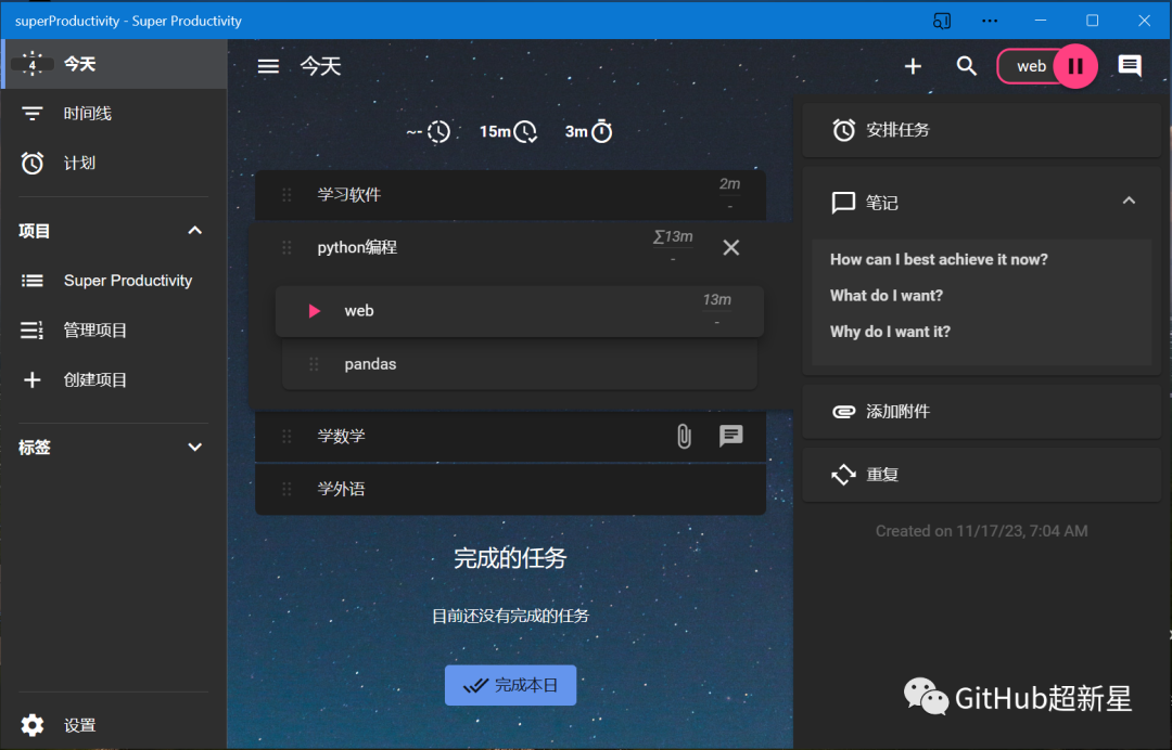 Super-Productivity提供了提醒和番茄钟功能,用户可以设定提醒事项和番茄工作时间,帮助自己更好地集中注意力和保持工作状态。这对于提高工作效率和时间管理能力非常有帮助,可以避免拖延和分心。