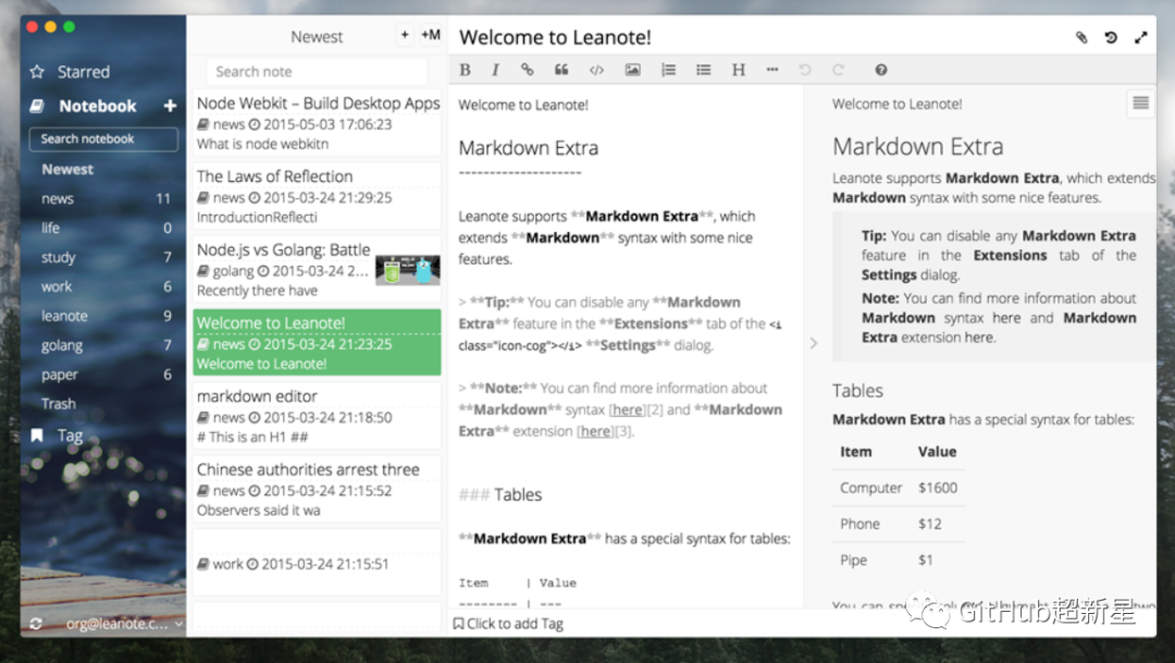 Leanote Desktop拥有直观的界面和简单易用的操作方式,使得用户可以轻松创建、编辑和格式化笔记。通过简洁的工具栏和快捷键,用户可以快速进行文字排版、插入图片和链接等操作,提高了工作效率。此外,Leanote Desktop还提供了全文搜索功能,方便用户快速找到所需的笔记内容。