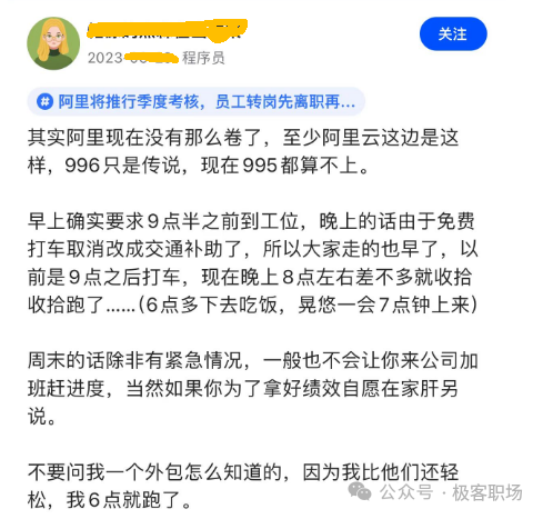 这种评论反映出公众对大型科技公司工作文化的刻板印象与实际情况之间可能存在的差异。虽然阿里巴巴在早期可能以其高强度的工作文化而闻名,但随着时间的推移,公司可能已经在努力改善员工的工作环境和工作生活平衡。