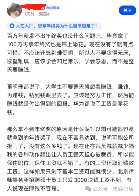 网友进一步分析了拿不到年终奖的可能原因,指出这可能是因为公司经济状况紧张或政策调整。他提醒,目前许多公司正在裁员和减少福利,所以能保住工作和工资已经算是幸运。网友还提到,现在的工资水平可能下降,举例说在北京有律师事务所招聘硕士员工的工资仅为3000元,这反映了目前赚钱的难度。