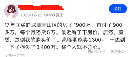 一位来自OPPO的员工网友在2017年底花了1900万元买了一套位于深圳南山区的房子,当时她支付了900多万元的首付。从那时起,她每个月需要还5万元的房贷。但最近,她发现这套房子的价格竟然跌到了她购买时的价位,这让她感到非常不开心。特别是考虑到市场最高峰时,这套房子的价值甚至能达到2300多万元,这意味着她在纸面上损失了大约3到4百万元。她最初选择这个房子是因为附近有一所学校,认为作为学区房应该更加稳定,但现实的情况却出乎她的预料,导致她感到失望和困扰。