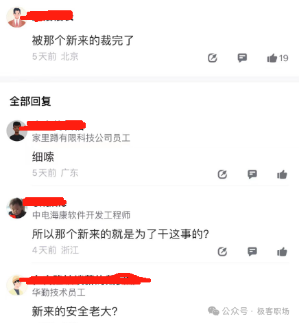 简单来说,网友们在猜测网易有个新来的领导,他可能是被带进来专门为了管理裁员这件事。有人问这个新来的是不是安全部门的负责人,另一个人回复说,可能是自己人被换掉了,新的领导进来了。