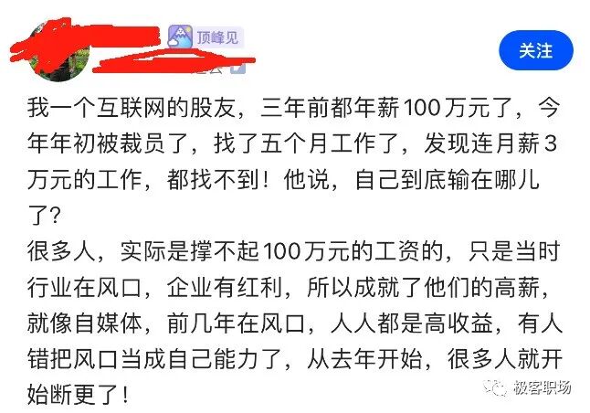 不少人曾在行业的顺风车上,享受着不菲的薪酬。然而,这些高薪并非完全因为他们的能力,而是行业大潮带来的暂时福利。就像自媒体的黄金时期,人人都能从中分得一杯羹,但随着风口过境,很多人开始无力更新内容。