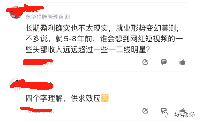 网友:长期盈利确实也不太现实,就业形势变幻莫测,不多说,就 5-8年前,谁会想到网红短视频的-些头部收入远远超过一些一二线明星?