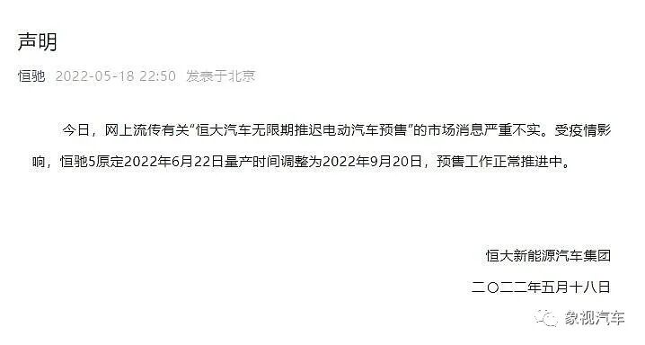 近日网络流传“恒大汽车无限期推迟电动汽车预售”的消息,虽然恒大辟谣了,然而也确认恒驰5原定2022年6月22日量产时间的确推迟了,调整为2022年9月20日。苦苦支撑的许家印,不知道能不能看到恒驰5真正量产上市的那一天。