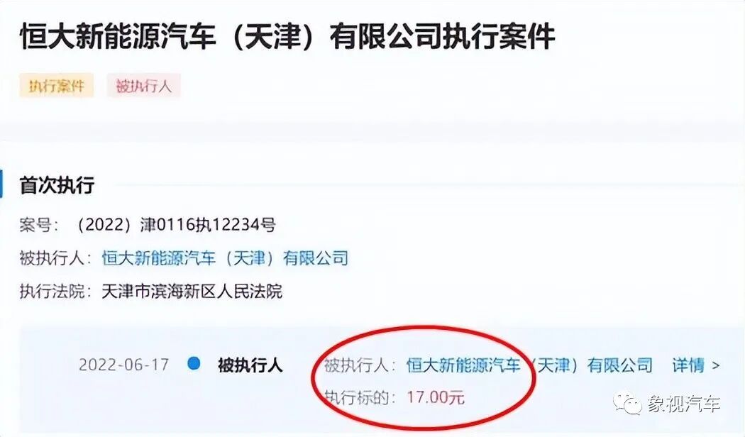 媒体报道显示,恒大新能源汽车(天津)有限公司近日新增三条被执行信息,其中的一条被执行信息标的金额仅为17元,实在是让人难以想象。难道恒大汽车的情况已经恶化到彻底躺平的地步了吗?