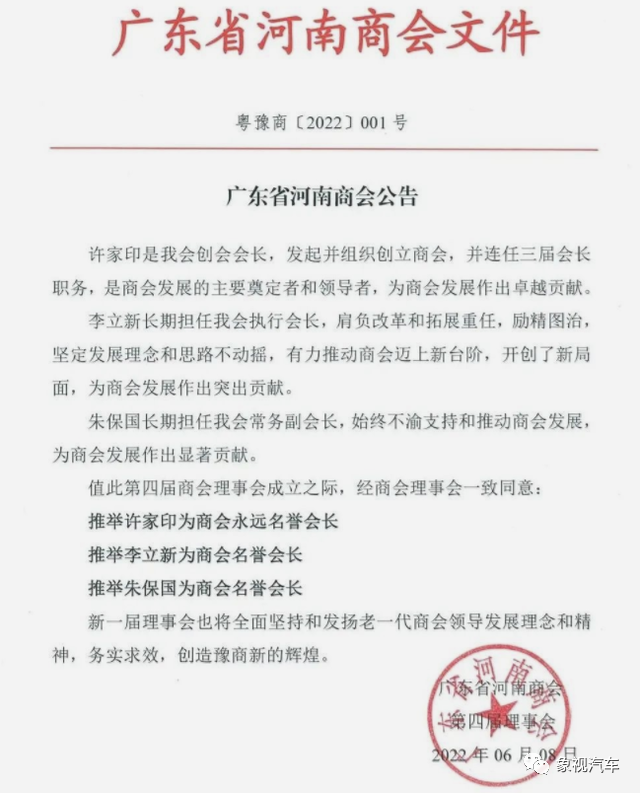 文件显示,广东省河南商会基于“许家印是我会创始会长,发起并组织创立商会……是商会发展的主要奠定者和领导者”,所以推举许家印为商会永远名誉会长。