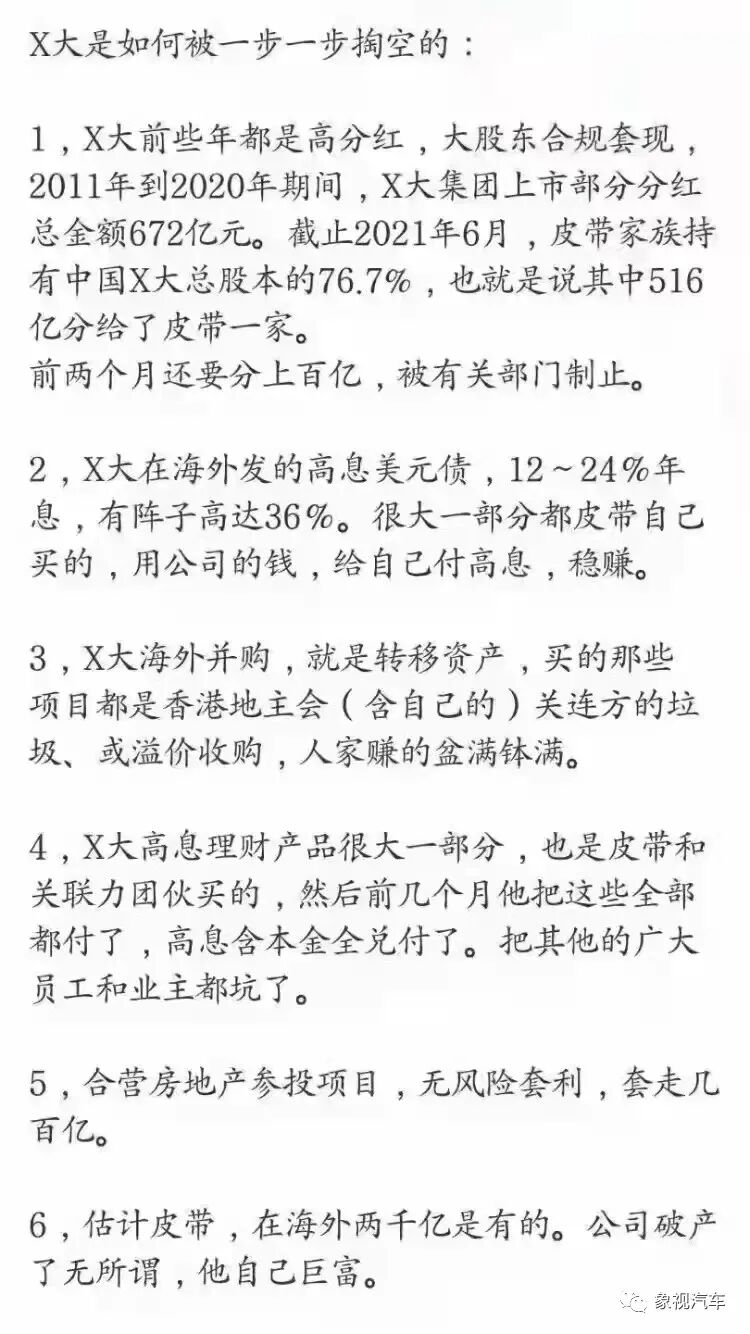 其次,恒大员工也会人心惶惶,因为指标要求,很多内部员工都购买了恒大财富的理财产品。万一恒大破产,他们不仅理财款拿不回来,而且还要面临工资损失和失业风险,可谓祸不单行。还有,恒大的上下游合作方,很多人的债务可能无法追回。此外,恒大旗下其他业务板块也遭遇危机。恒大集团自身都难保,也就无法顾及持续亏损的恒大汽车了。恒大汽车能够卖给小米汽车等其他车企,都算是很好的结局了。