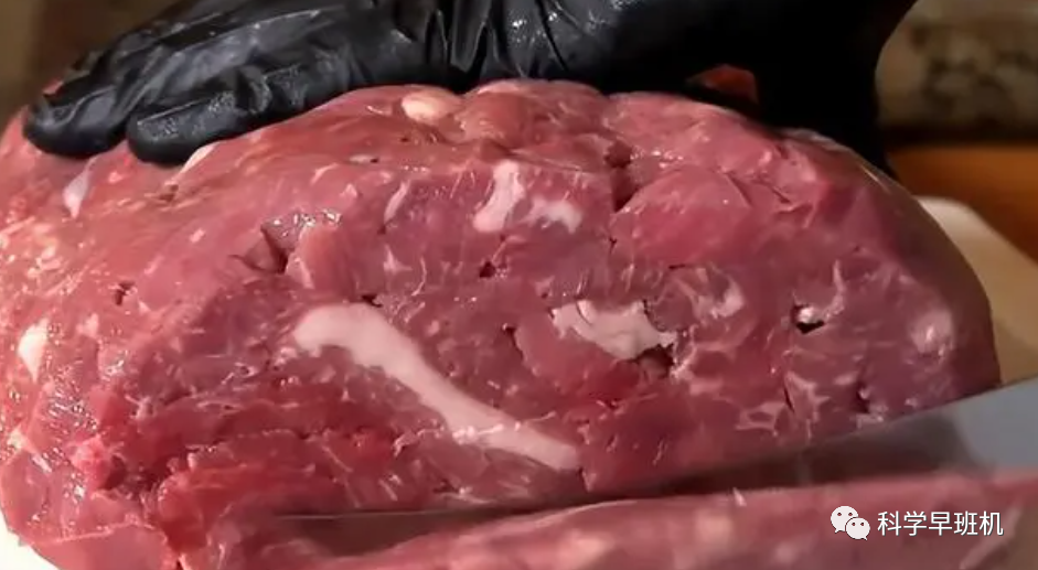 如果是在肉类市场售卖的假牛肉,商家还会用工具把它们碾压到完全看不出是什么肉为止,并在外层精心加工成牛肉的纹理,这样就可以达到以假乱真的目的。